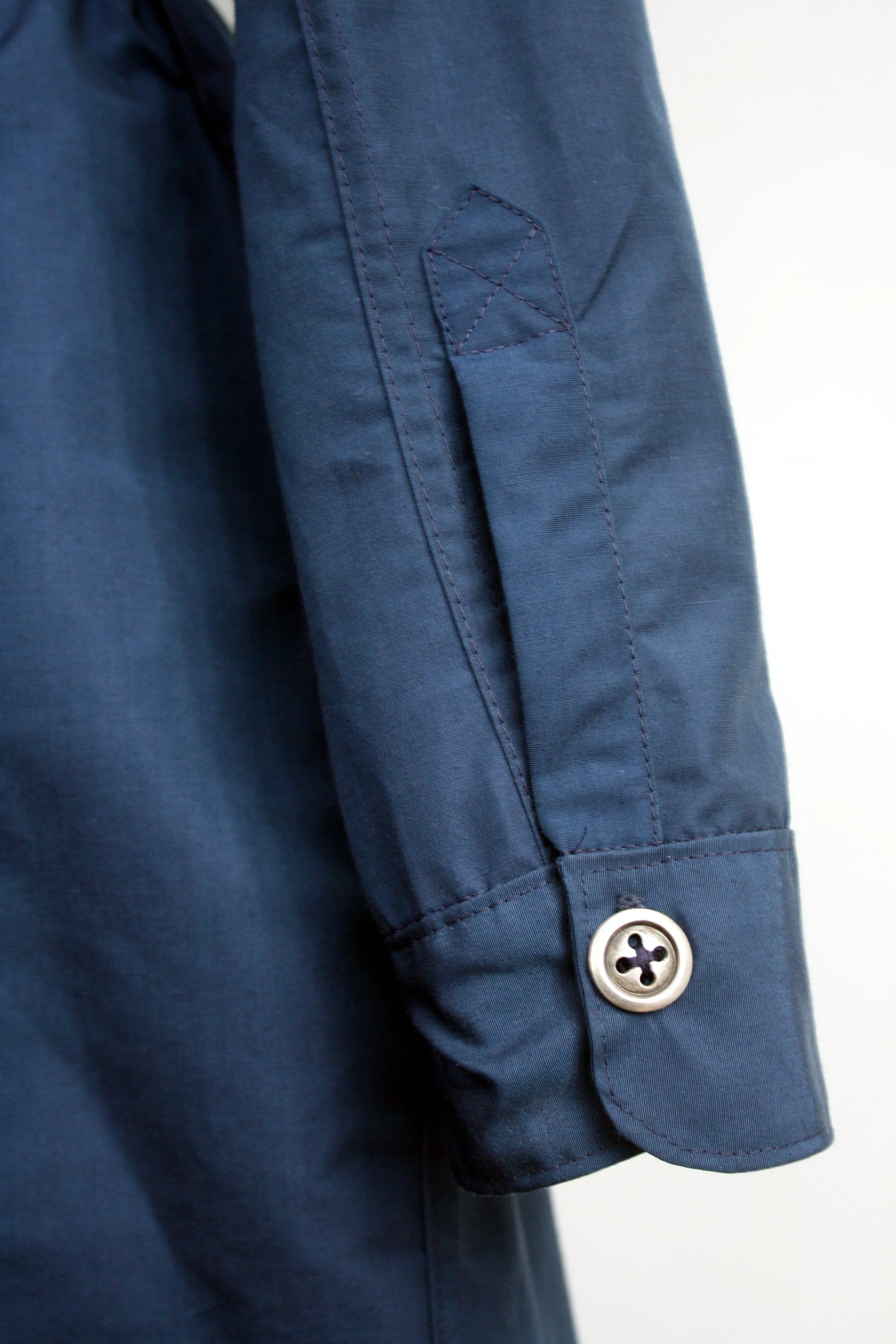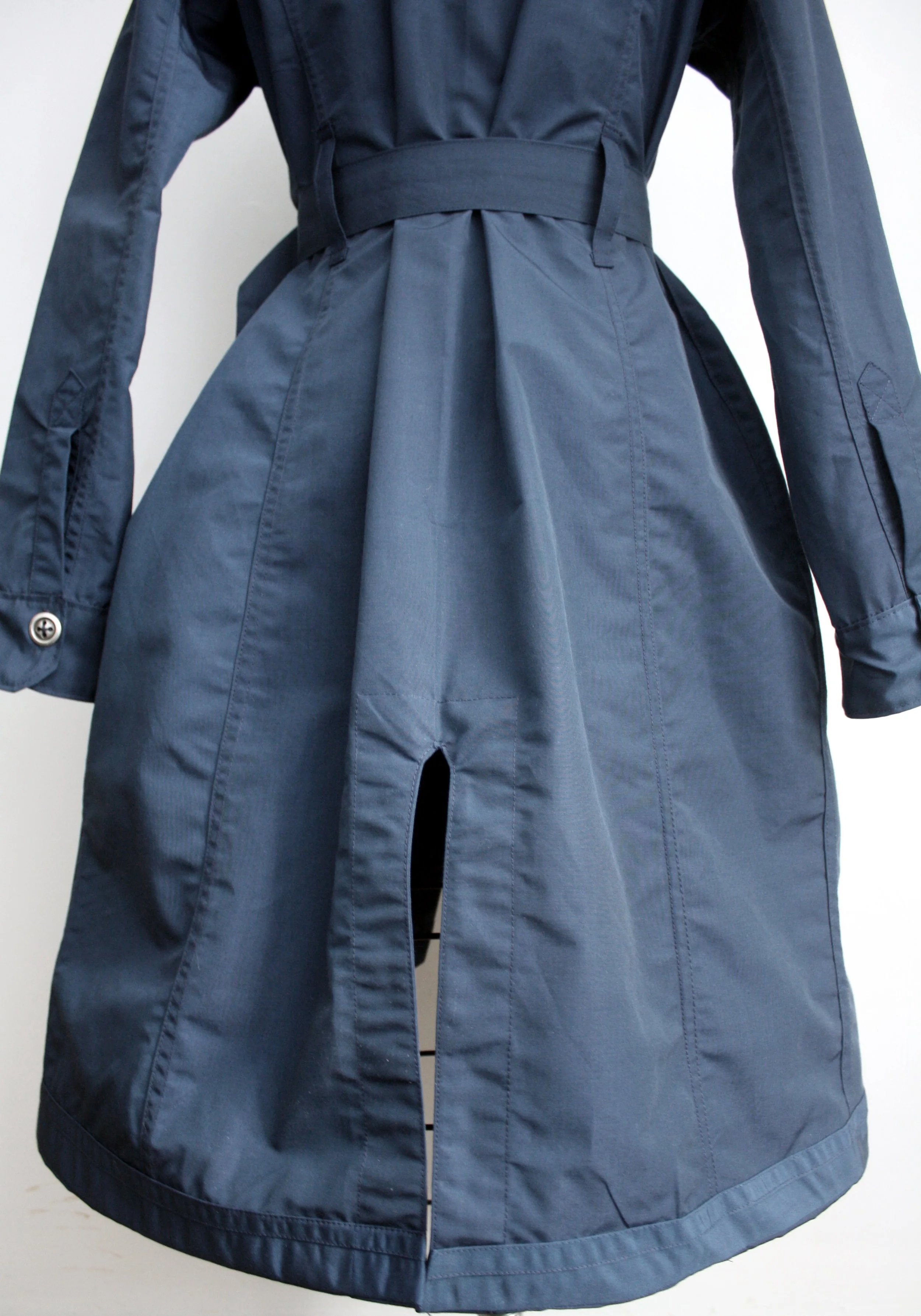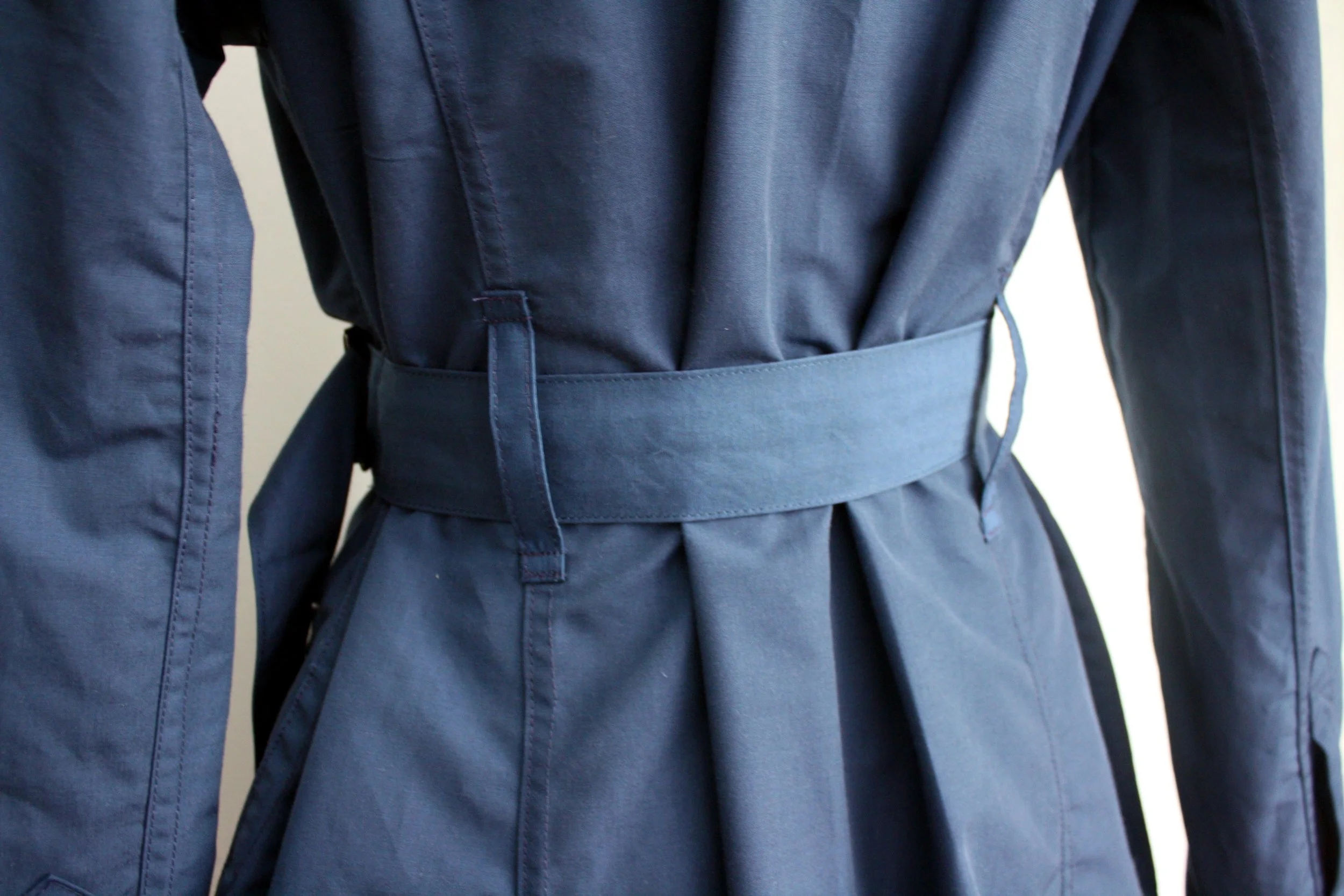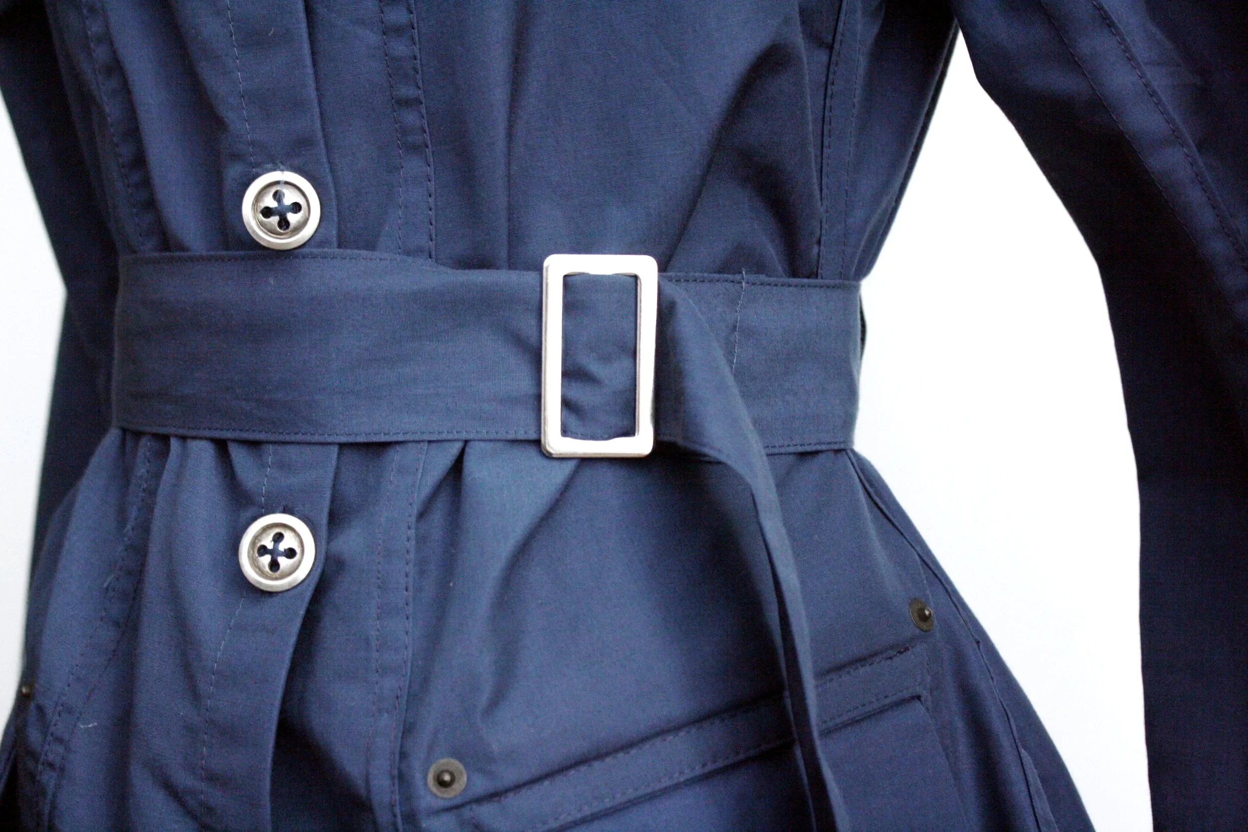 This navy trench coat features a high mandarin collar, belt, metal buttons, and deep jetted pockets.