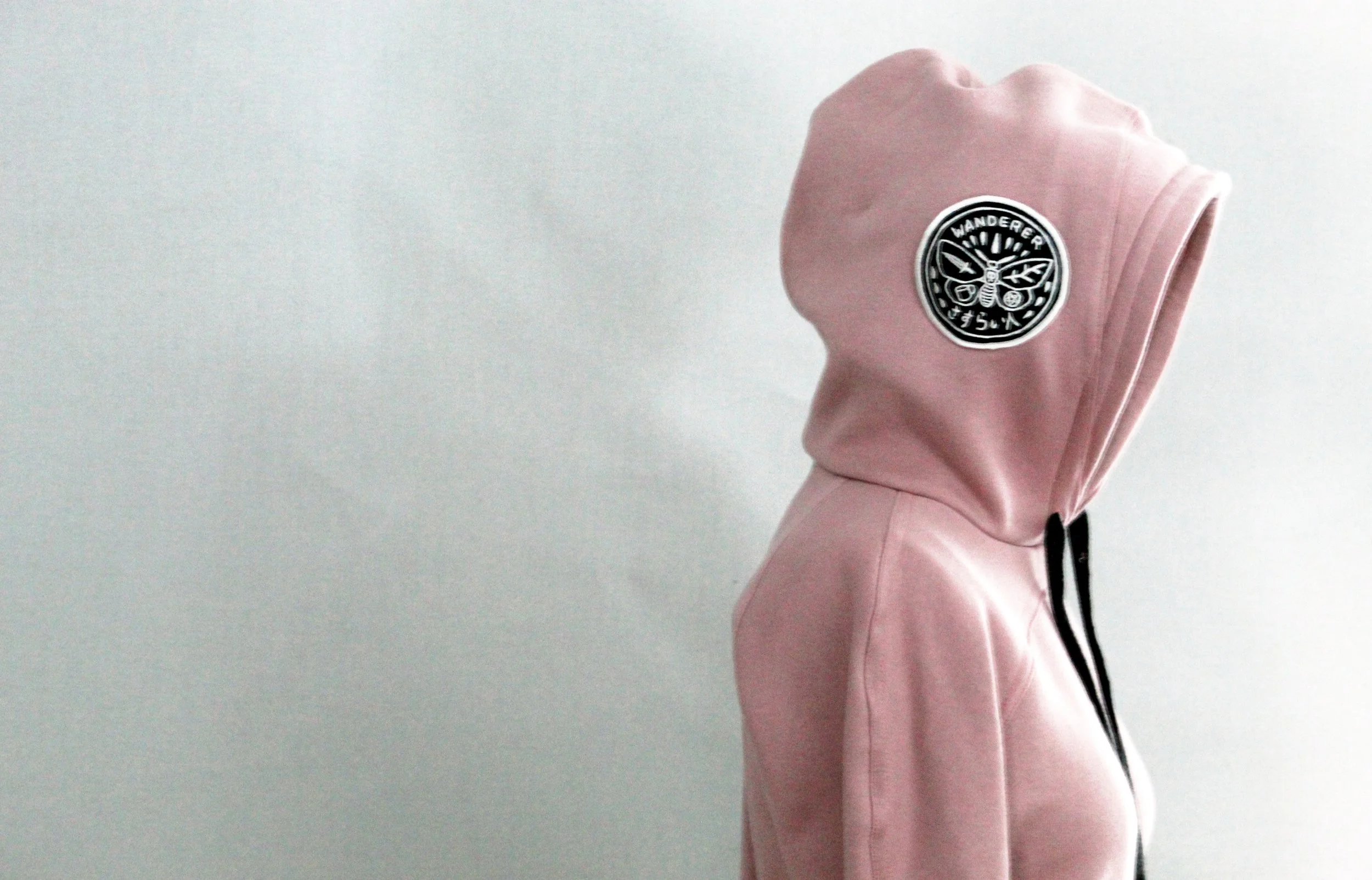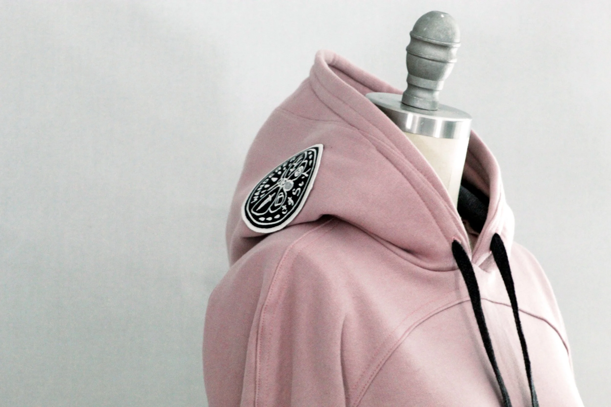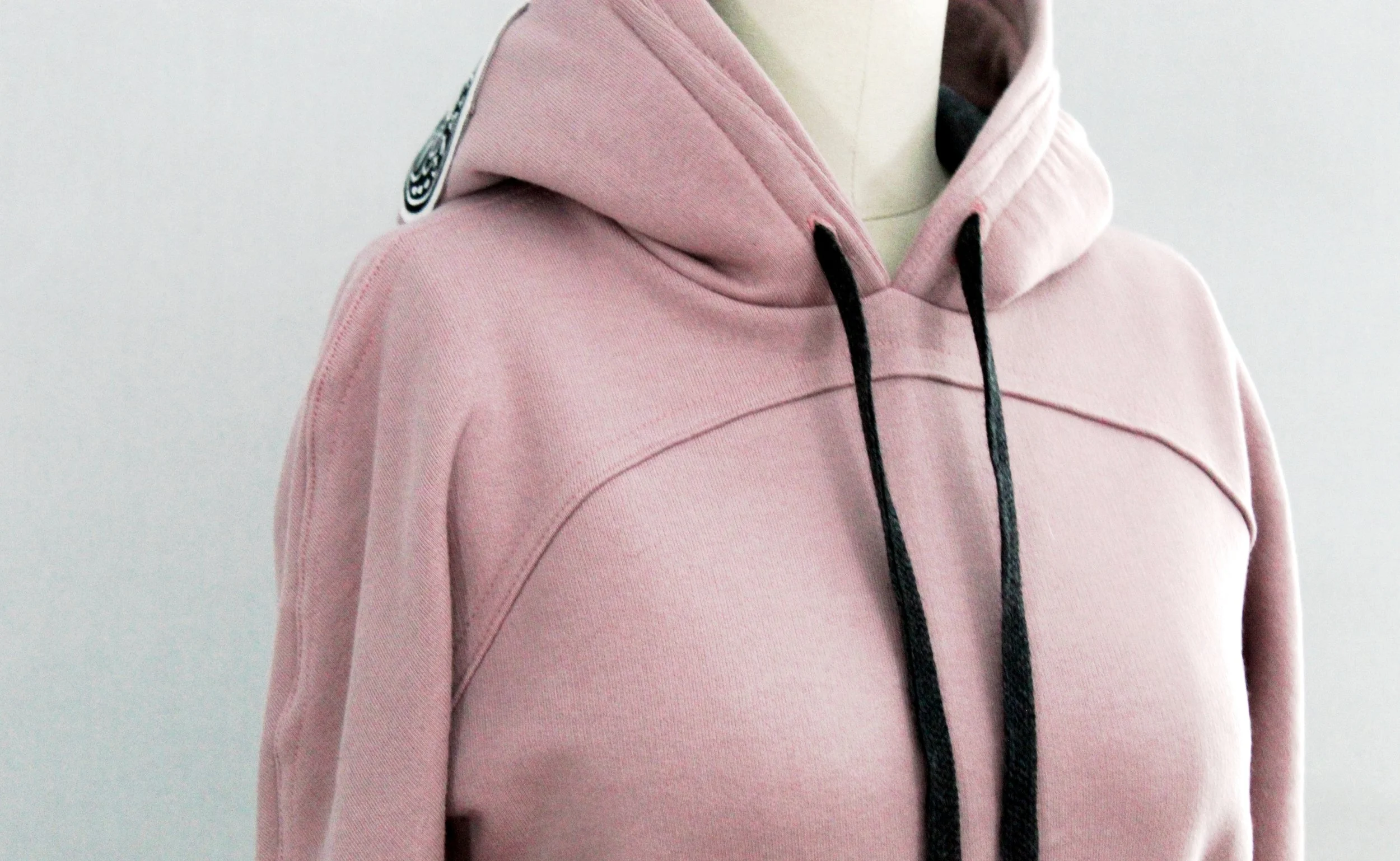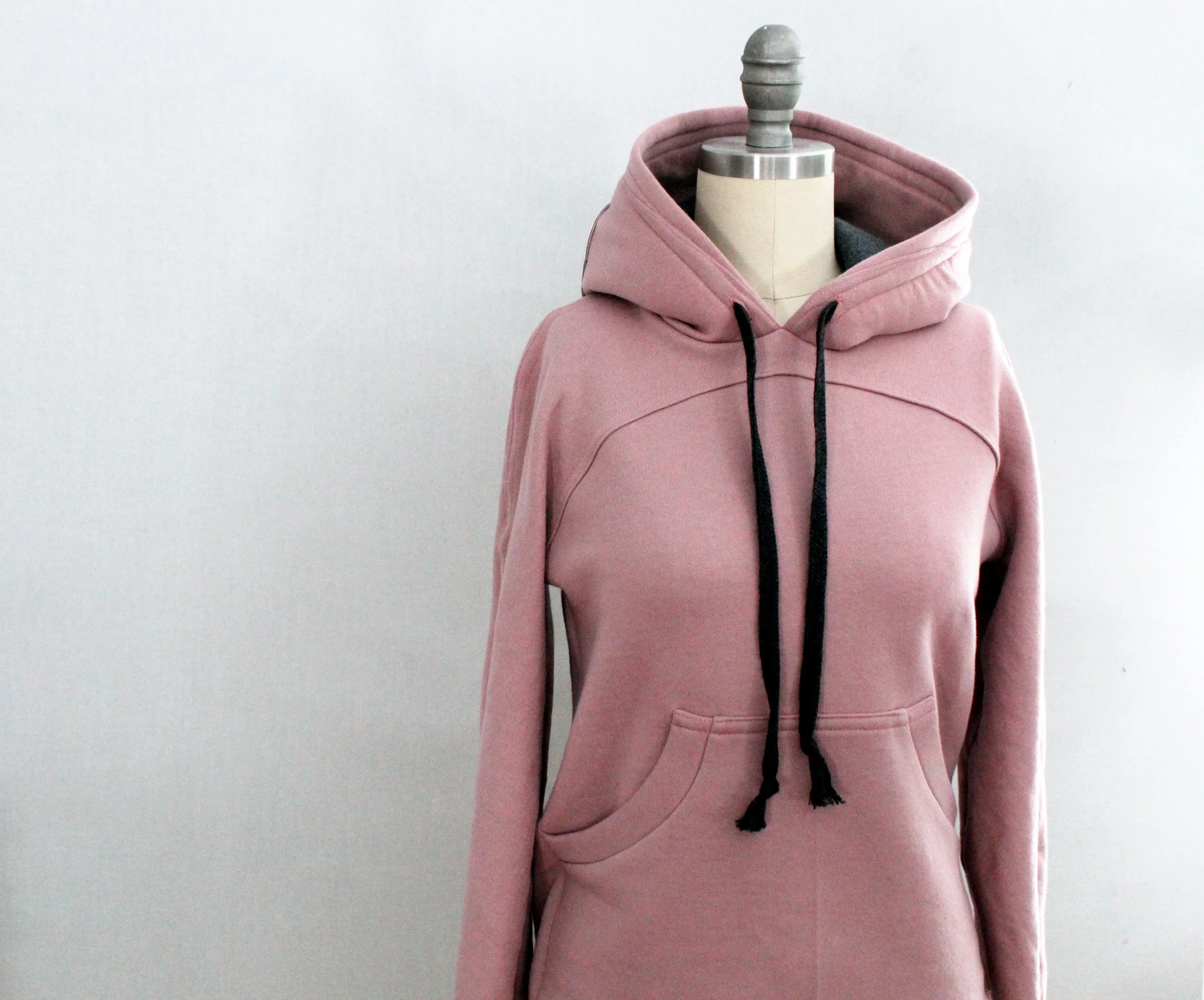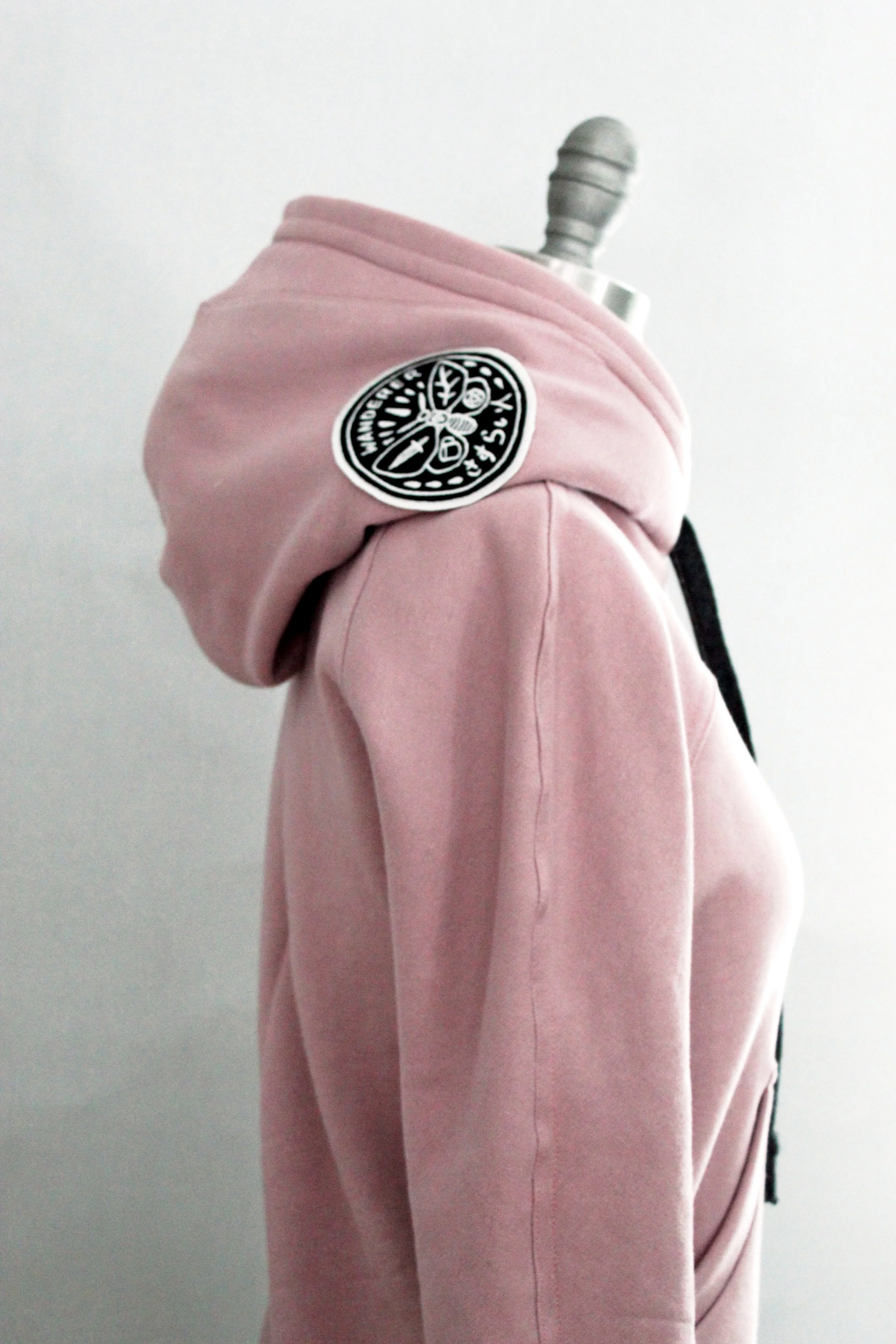 This blush pink hoodie is part of my me-made wardrobe. This hoodie features a unique curved seam across the chest, front kangaroo pocket, and a patch embellishing the drawstring hood. It is made from an organic cotton sweatshirt fleece