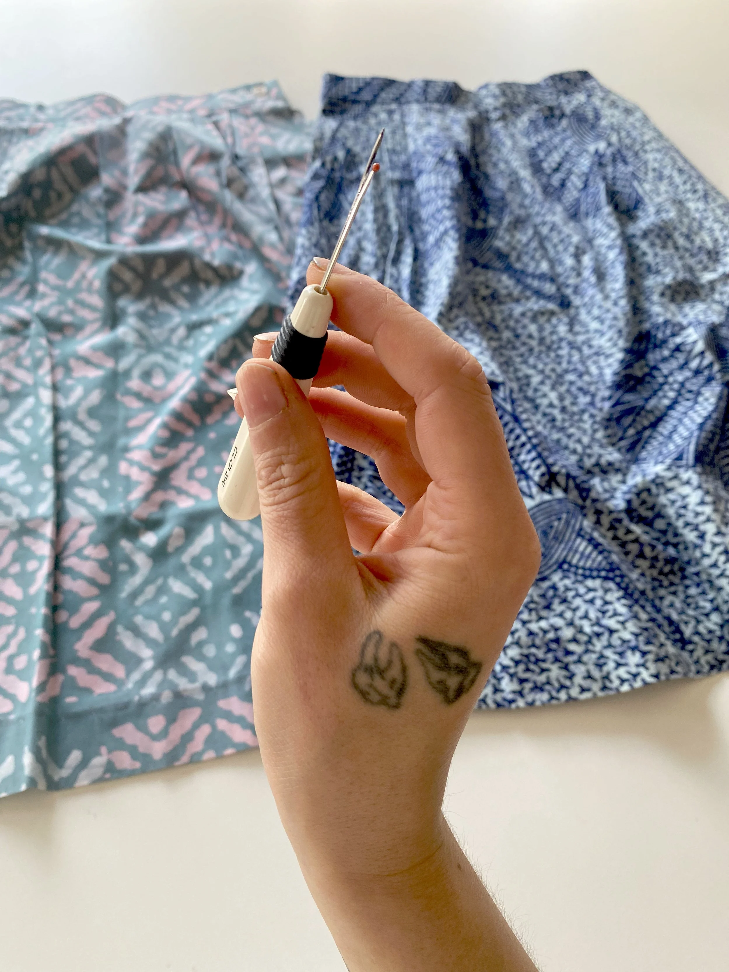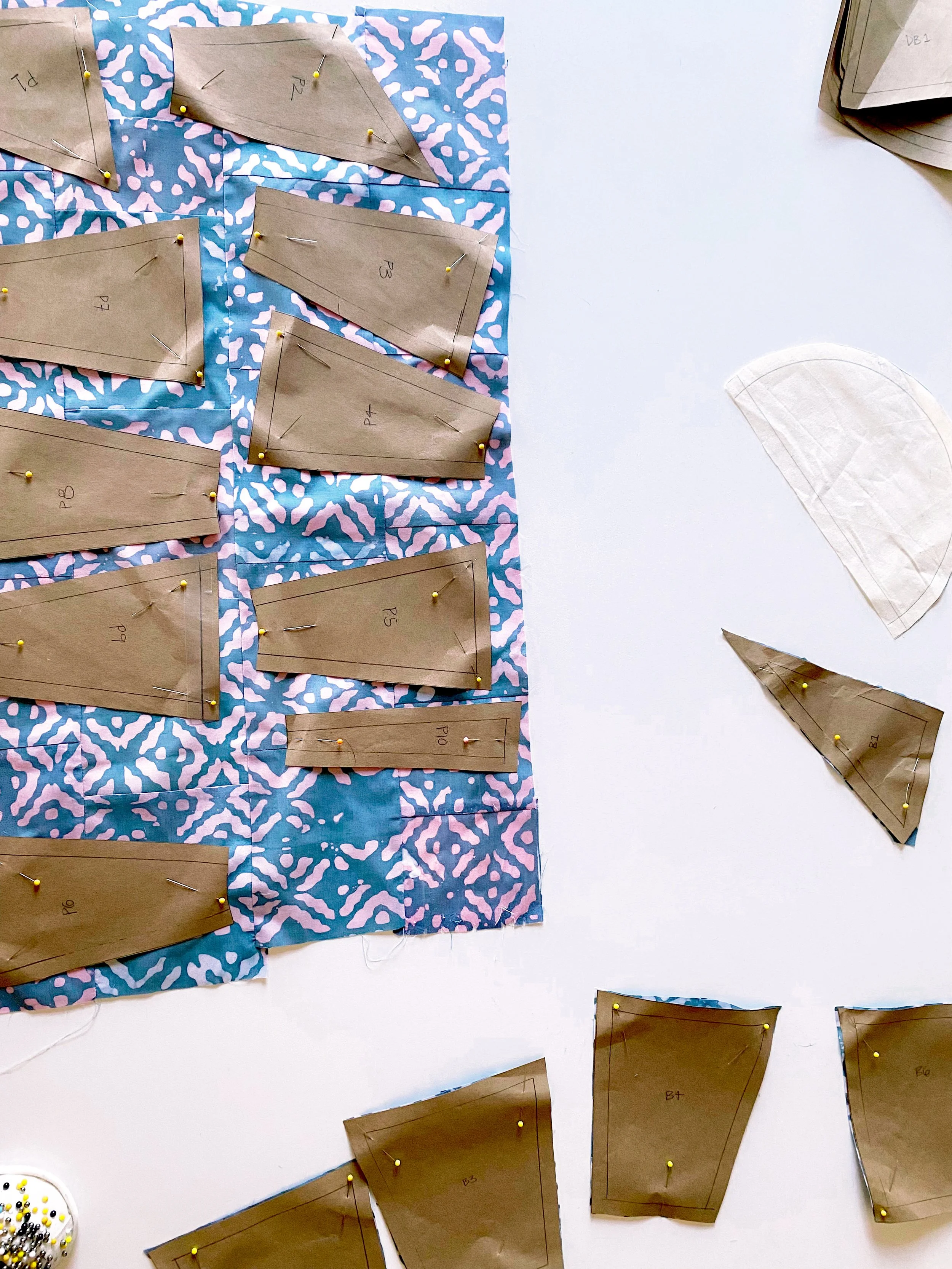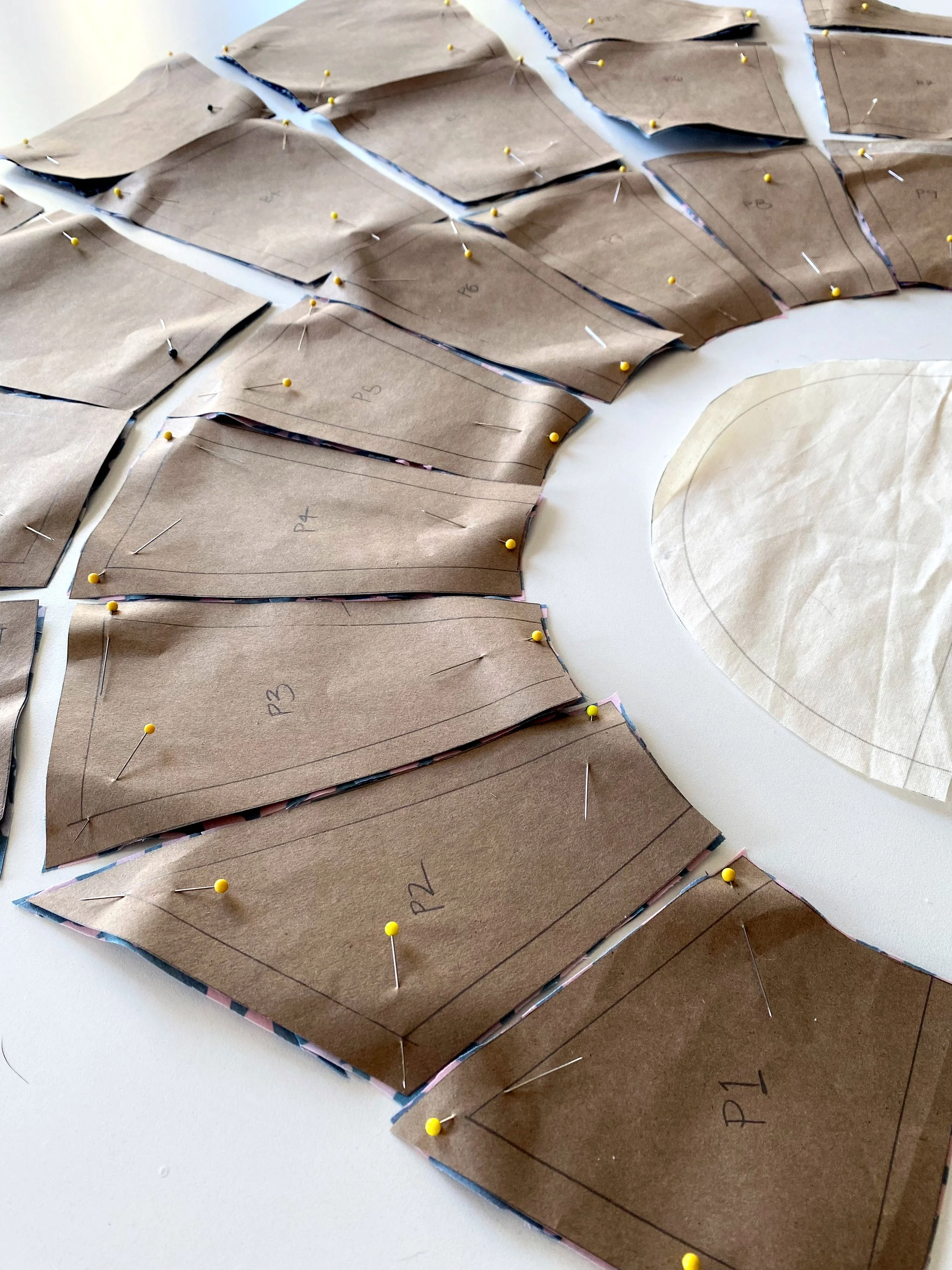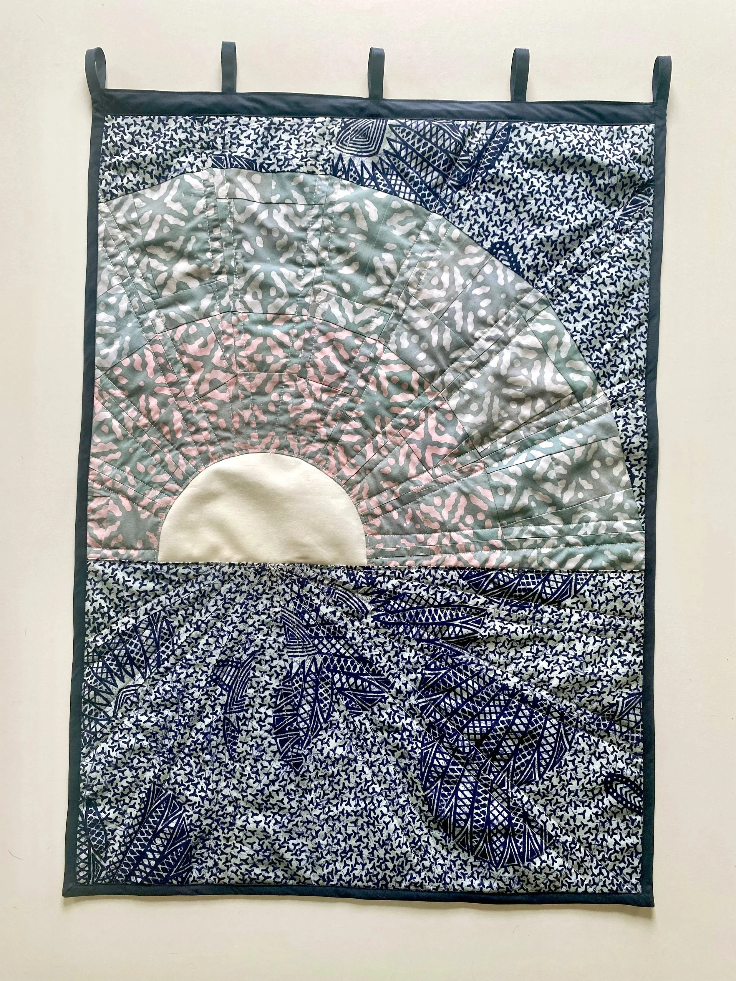 Using two cherished skirts from a client’s late grandmother, I created this patchwork sunrise wall quilt.