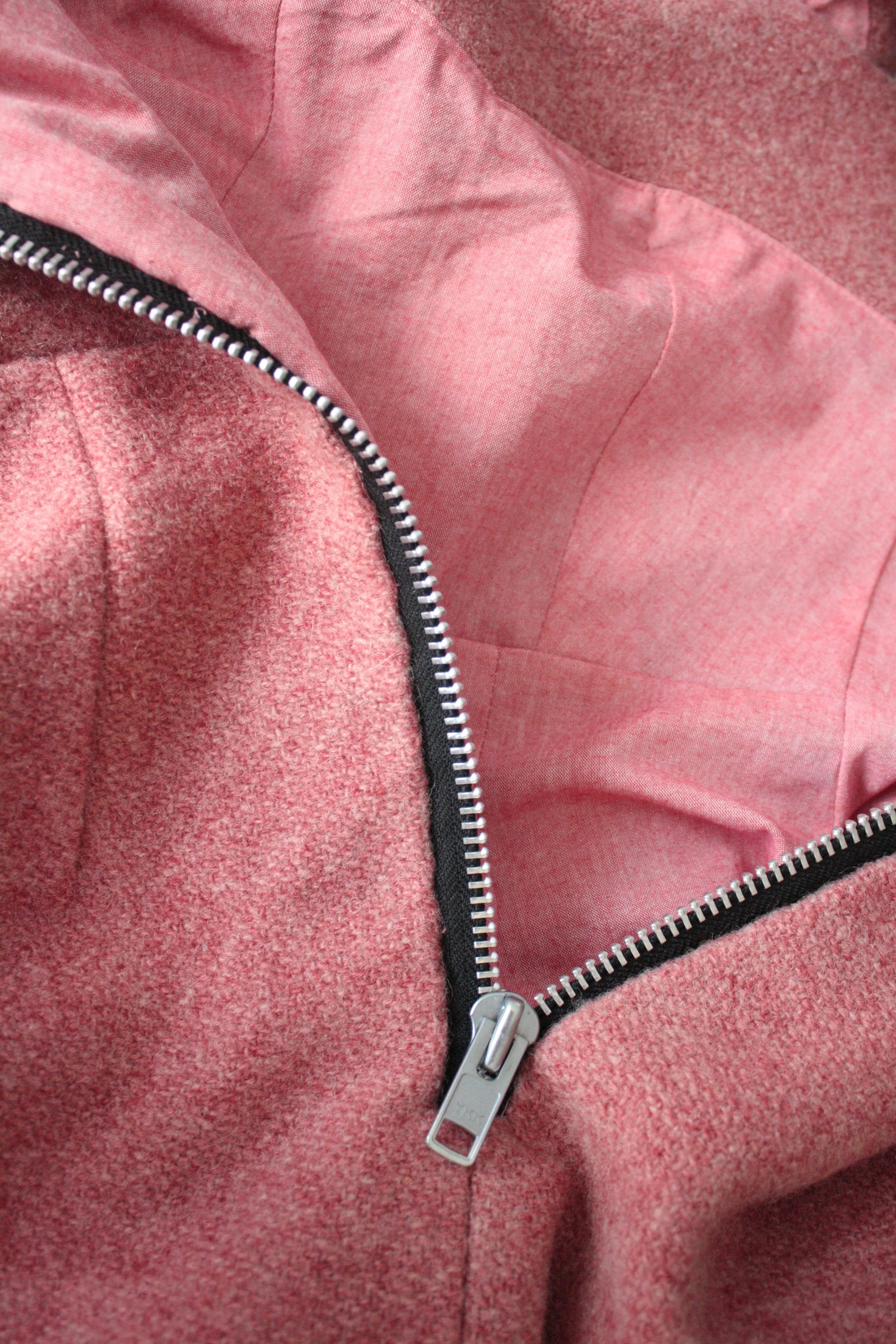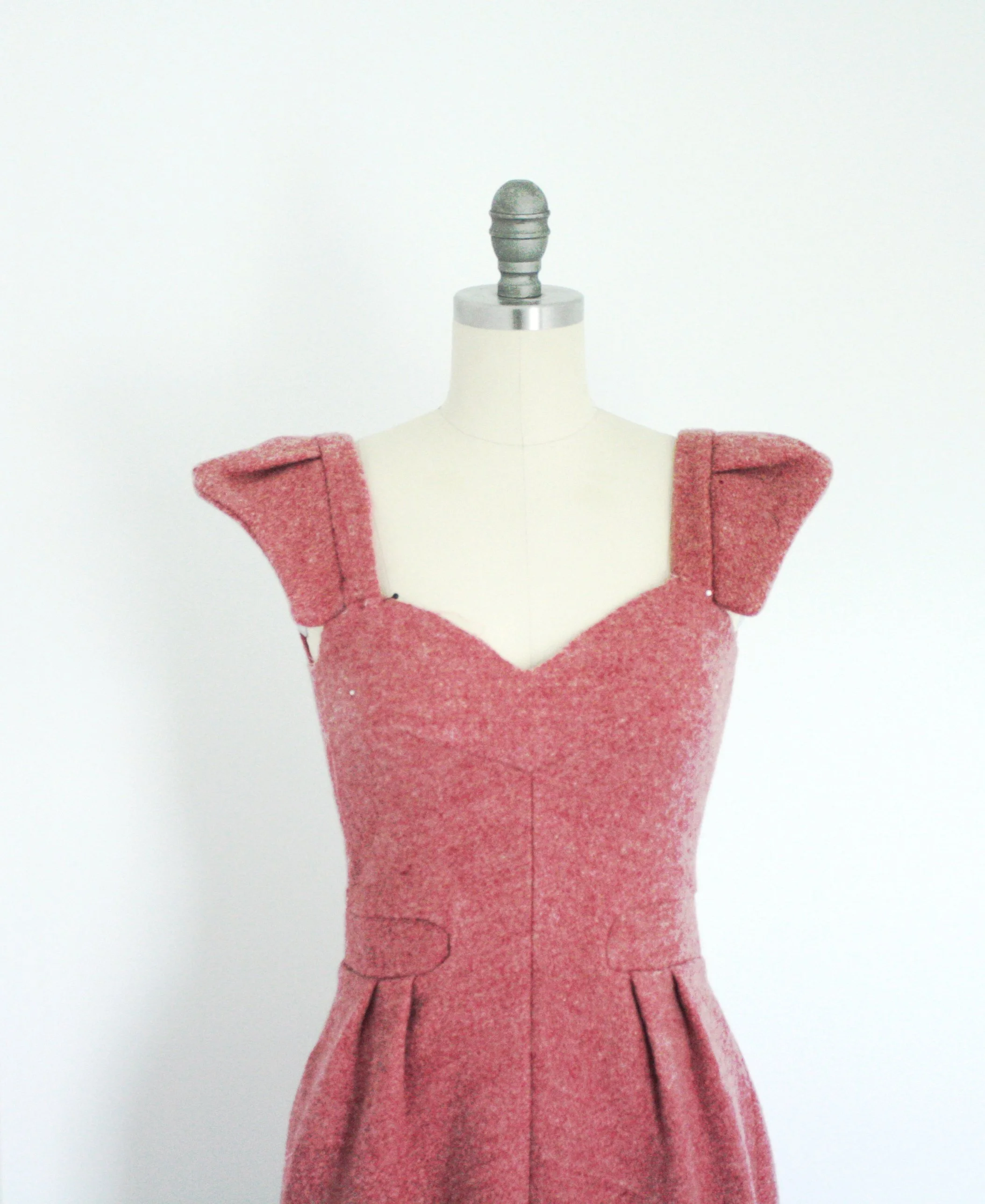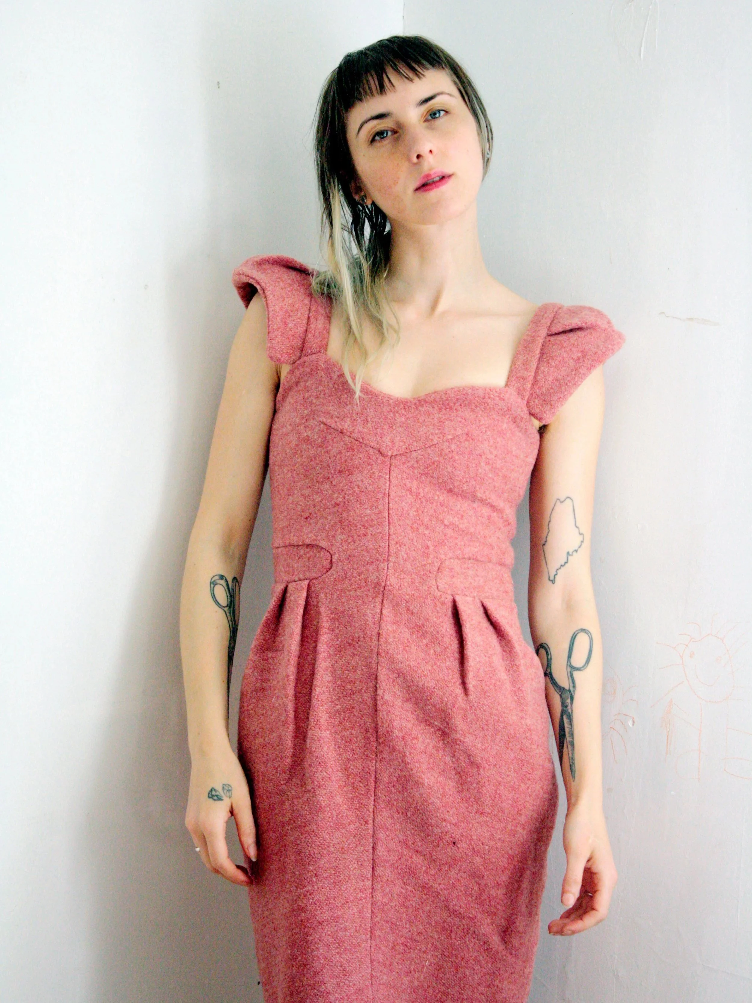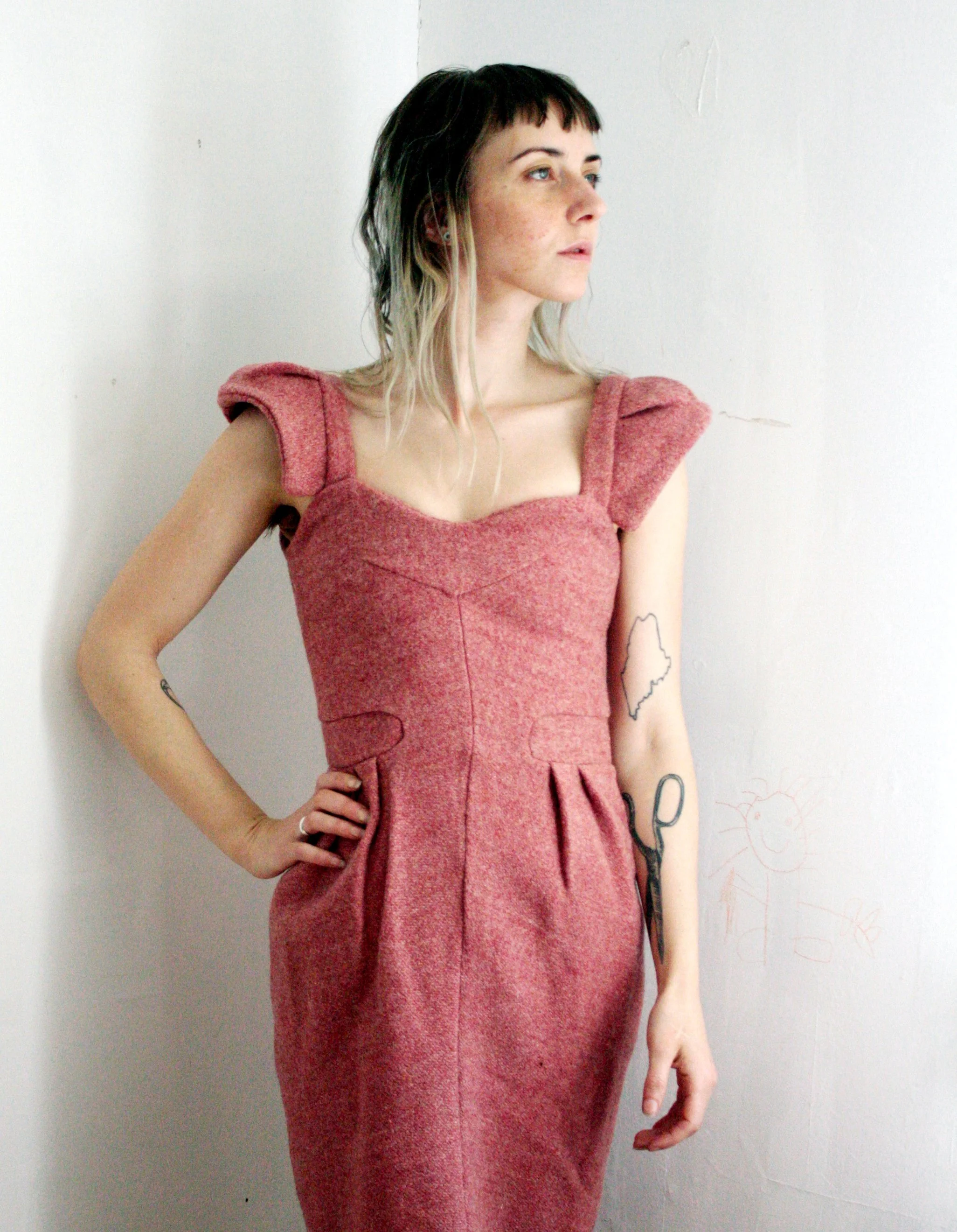This dress was made from entirely repurposed materials, excluding the metal zipper in the back. The main material of the dress comes from a ratty wool blanket that was full of holes, and the dress is lined with an old bed sheet.