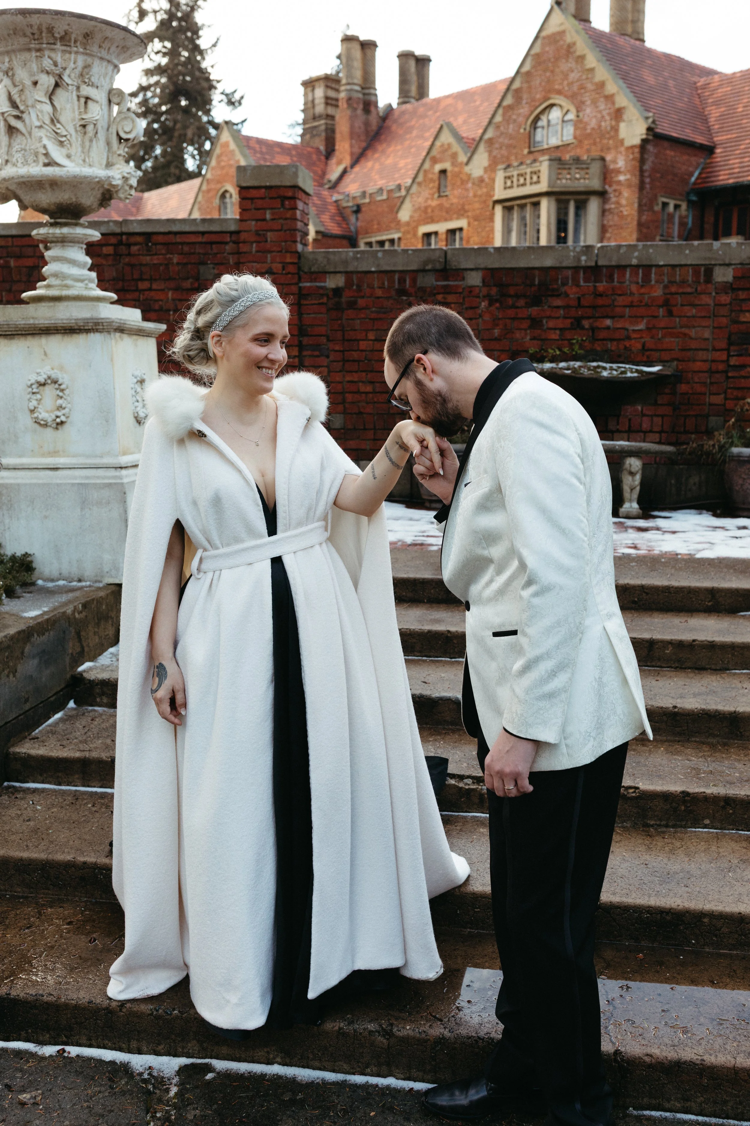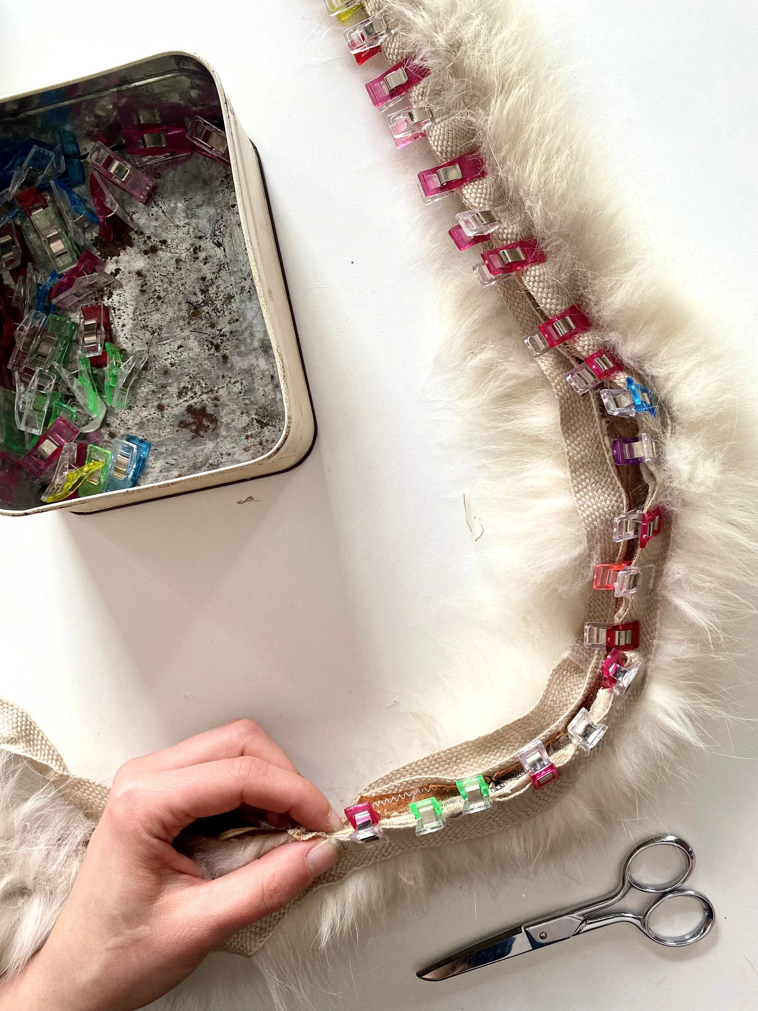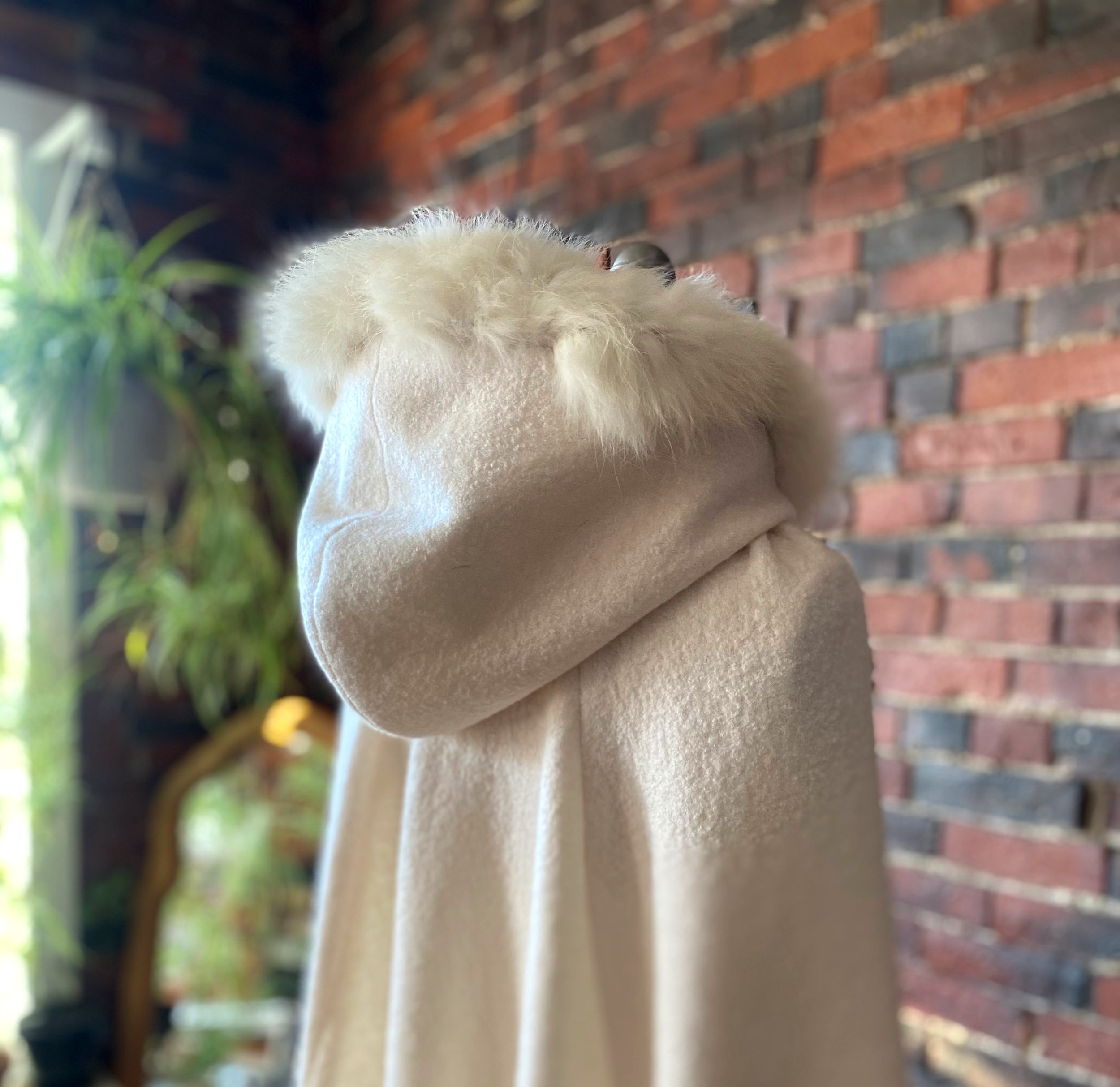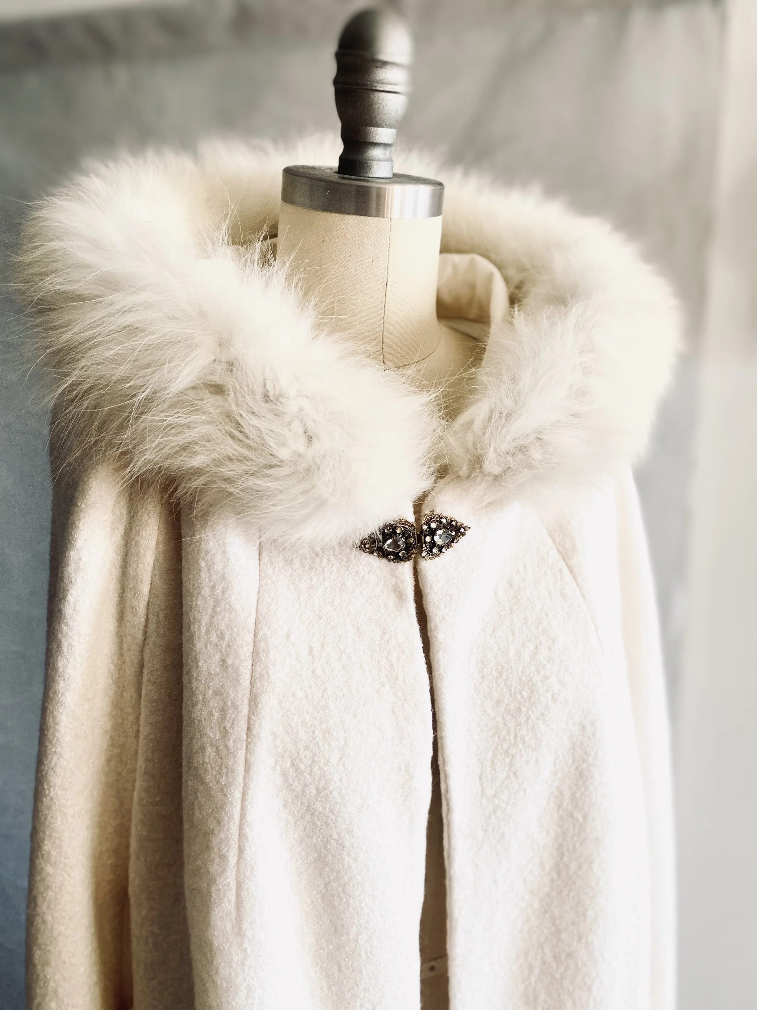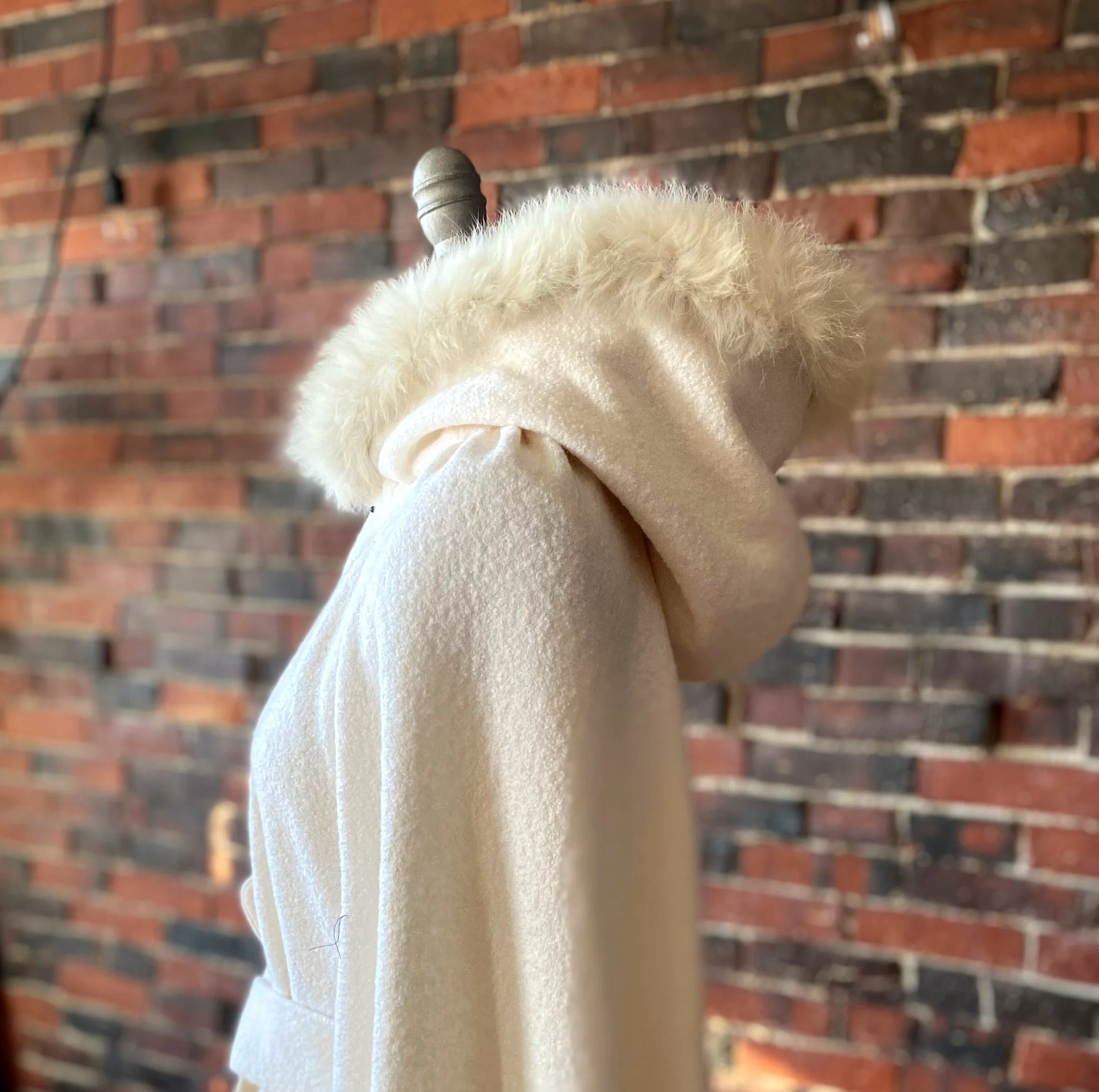This custom wedding cloak was made through mail-order fittings with a far away client. Made from a heavy boiled wool and viscose blend, cotton lining, and repurposed second hand rabbit fur.
